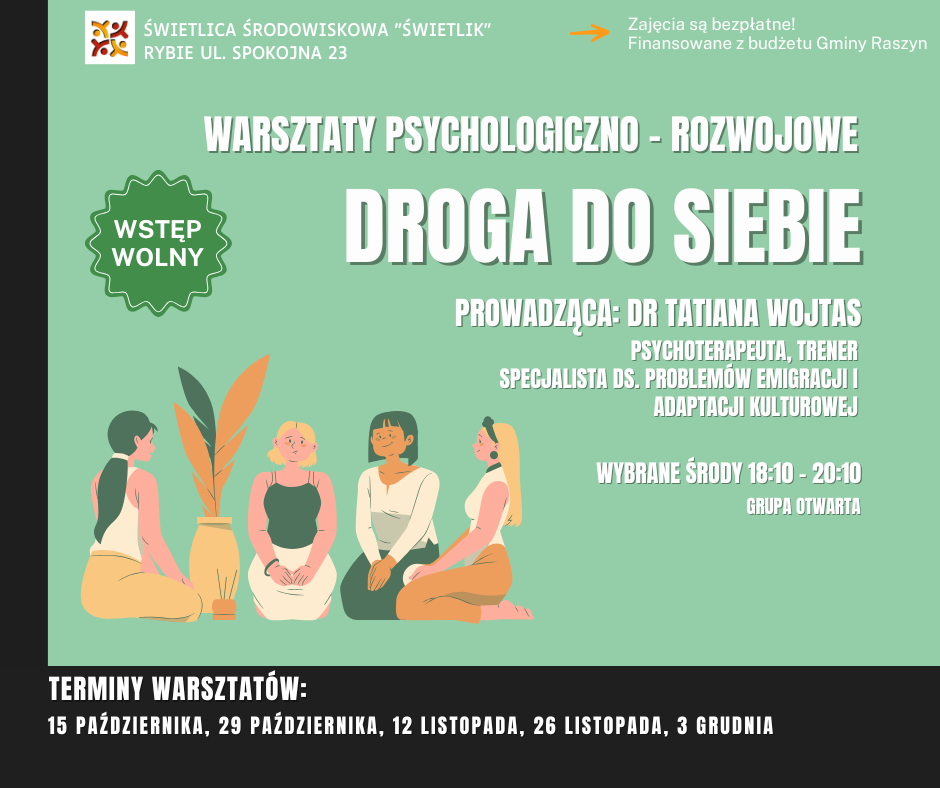 Świetlica Środowiskowa „Świetlik” w Rybiu zaprasza do udziału w warsztatach psychologiczno-rozwojowych „Droga do siebie”, które poprowadzi dr Tatiana Wojtas – psychoterapeutka, trenerka oraz specjalistka w zakresie problemów emigracji i adaptacji kulturowej.