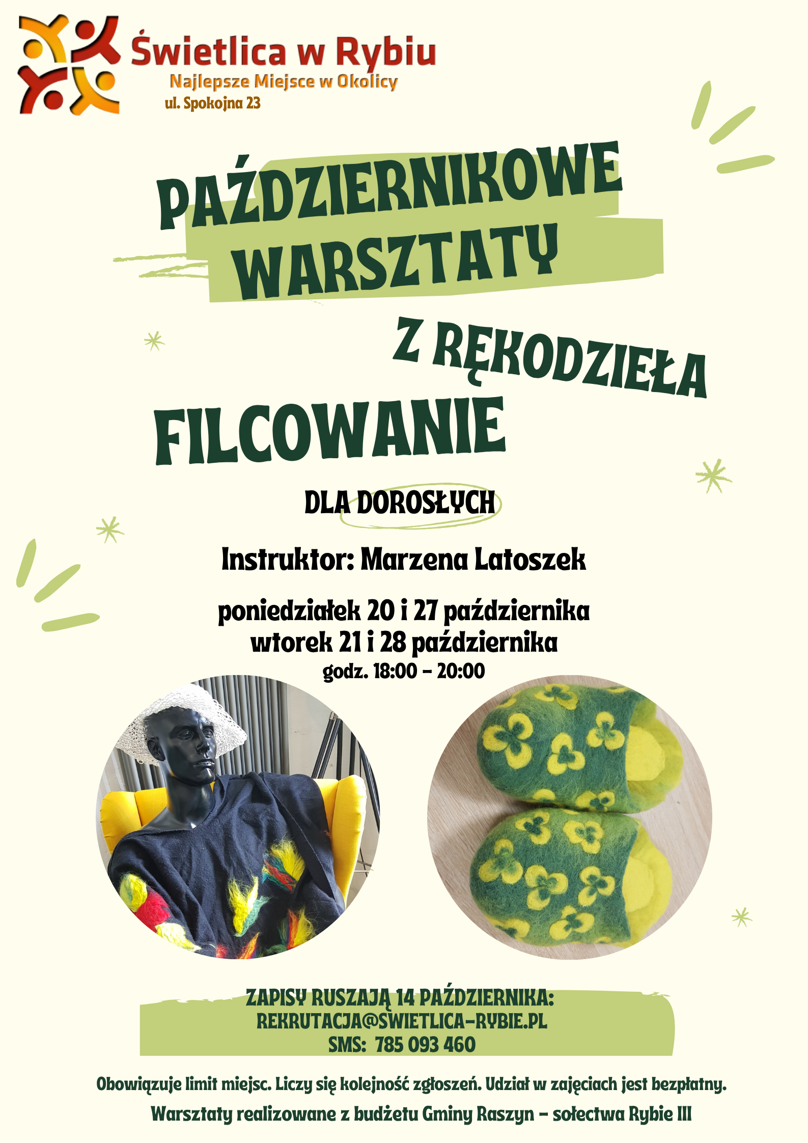 Świetlica Środowiskowa „Świetlik” w Rybiu serdecznie zaprasza mieszkańców Gminy Raszyn na bezpłatne warsztaty filcowania, które odbędą się w październiku, w poniedziałek 20 i 27 października oraz wtorek 21 i 28 października w godzinach 18:00–20:00.