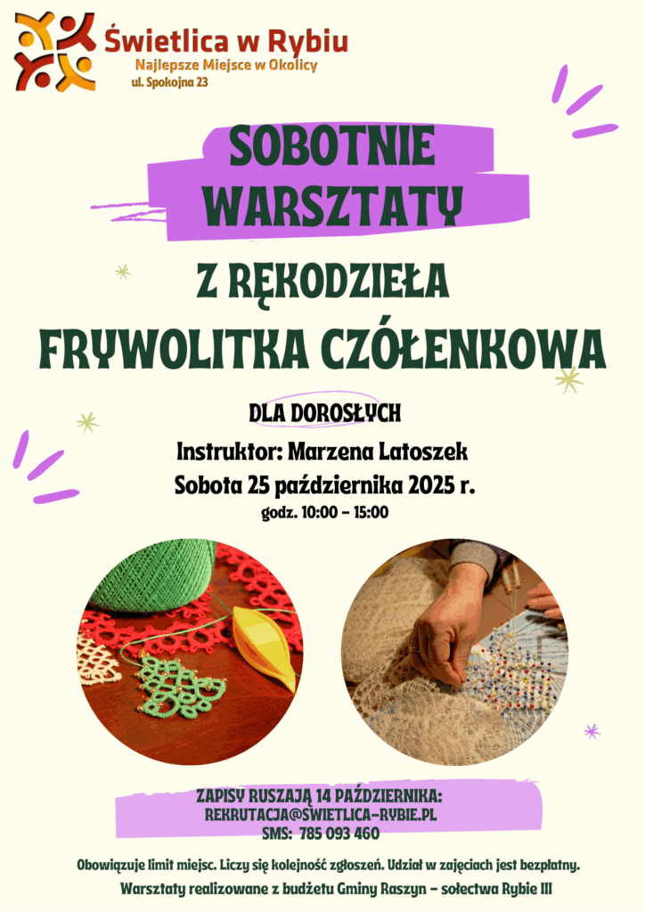 Świetlica Środowiskowa „Świetlik” w Rybiu zaprasza mieszkańców Gminy Raszyn na bezpłatne warsztaty z frywolitki czółenkowej, które odbędą się w sobotę, 25 października 2025 r. w godzinach 10:00–15:00.